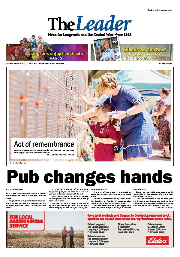 Longreach Leader Today – 14th November 2025 Subscribe or Login to see the rest of the content. Username Password * Remember Me Forgot Password News Your Online Comments 16/11/2025 'FIRST LADY' OF LONGREACH Lynette Hasted: I can remember Mrs Hughes. She was quite a stern lady and a good friend of my grandparents, Etta... Rolling out a new Longreach-Winton link 16/11/2025 If I were to say I’m about to share the story of something which greatly enhanced transport between Longreach and Winton and that the... CQ duo inspire Kangaroos to whitewash 16/11/2025 Central Queenslanders Harry Grant and Cameron Munster proved inspirational as Australia wrapped up their three-Test Ashes rugby league whitewash of England at Headingley. The Kangaroos...