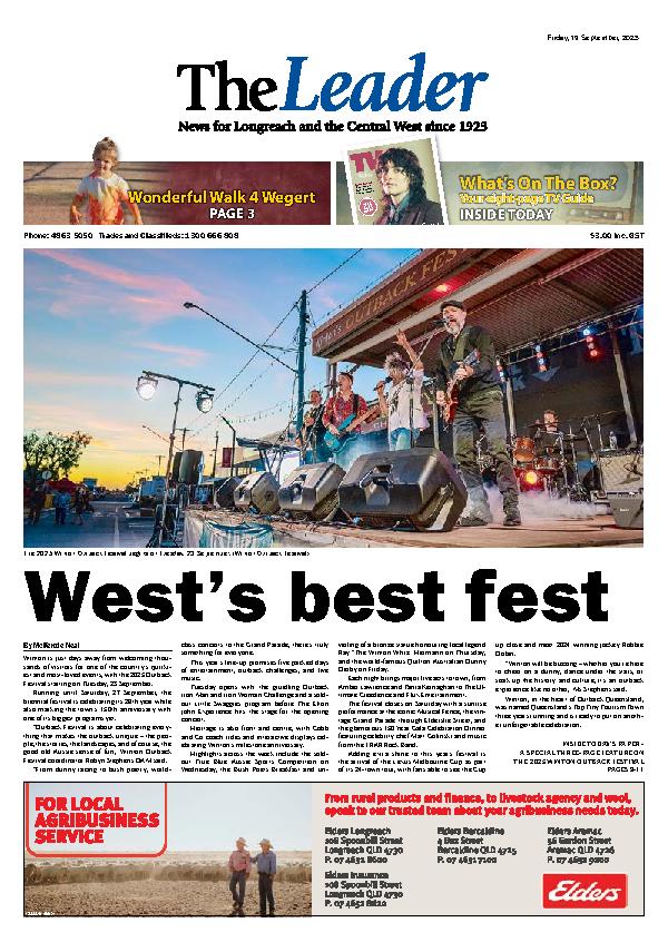 Longreach Leader Today – 19th September 2025 Subscribe or Login to see the rest of the content. Username Password * Remember Me Forgot Password News Big weekend in the West 09/10/2025 A big congratulations to the organisers of the Flyers Ball on hosting a very successful event. It’s a big date on our social calendar... Stars shine in Muttaburra 09/10/2025 While the biennial Ryder Cup captivated golf fans across the globe a fortnight ago, the Muttaburra Golf Club hosted its own brand of magic... Trail charts a new course 09/10/2025 Queensland’s rugged heartland will become Australia’s grandest stage when QLD Music Trails – The Outback returns for its fourth consecutive year from 24 April...