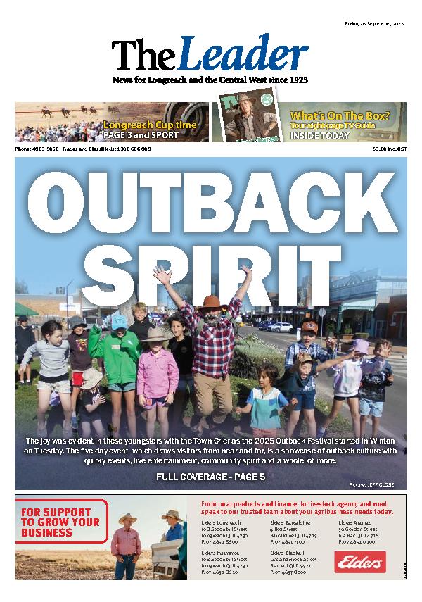 Longreach Leader Today – 26th September 2025 Subscribe or Login to see the rest of the content. Username Password * Remember Me Forgot Password News Big weekend in the West 09/10/2025 A big congratulations to the organisers of the Flyers Ball on hosting a very successful event. It’s a big date on our social calendar... Stars shine in Muttaburra 09/10/2025 While the biennial Ryder Cup captivated golf fans across the globe a fortnight ago, the Muttaburra Golf Club hosted its own brand of magic... Trail charts a new course 09/10/2025 Queensland’s rugged heartland will become Australia’s grandest stage when QLD Music Trails – The Outback returns for its fourth consecutive year from 24 April...