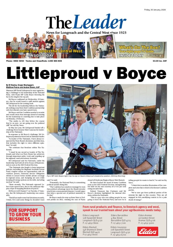 Longreach Leader Today – 30th January 2026 Subscribe or Login to see the rest of the content. Username Password * Remember Me Forgot Password News Longreach Bowls Club hosts AGM 31/01/2026 Longreach Bowls Club’s AGM was held on Thursday, 22 January, with some new members stepping into executive roles. John McGuckin (president) and Gail Butt (vice-president)... Aviation talks return West 31/01/2026 The future of regional air services is back on the agenda in outback Queensland, with the State Government launching the next phase of community... Country racing photographer in focus for award honour 31/01/2026 Queensland racing fans would have seen her work, but not many have seen the face behind the camera that has captured some of country...