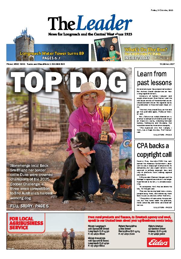 Longreach Leader Today – 31st October 2025 Subscribe or Login to see the rest of the content. Username Password * Remember Me Forgot Password News Changes to Central West GP practice fees 06/11/2025 GP consultations and other general practice procedures are now being bulk-billed for all Medicare-eligible patients at Central West General Practices as of 1 November. Service... The worrying trend that could put an end to rate cuts 06/11/2025 In the shock inflation print that scared the Reserve Bank off cutting interest rates at its latest meeting, two items gave governor Michele Bullock... Melham, McEvoys and Half Yours in the Melbourne Cup 06/11/2025 If you can't beat them, join them. It's the age-old phrase veteran trainer Tony McEvoy turned to when he needed a solution to Jamie Kah,...