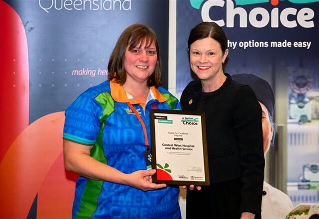 Better Choices Award – Central West Health Allied Health Rural Interprofessional Clinical Educator Liz McDonald (left) received the health service’s award from Health and Wellbeing Queensland Chief Executive Dr Robyn Littlewood. Ms McDonald accepted the award on behalf of Dietitian Sophie Gouveia who was unable to attend the event. (Supplied)
