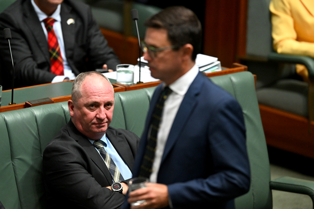 New England MP Barnaby Joyce Looks on as Nationals leader David Littleproud walks past during Question Time in the House of Representatives at Parliament House in Canberra. (AAP Image/Lukas Coch)
