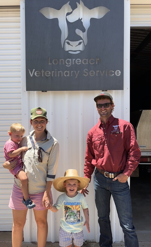 Ruby, Georgia, Cooper, and Jordan outside Longreach Veterinary Service, where they’ve found a home in the heart of the Outback. (Supplied)