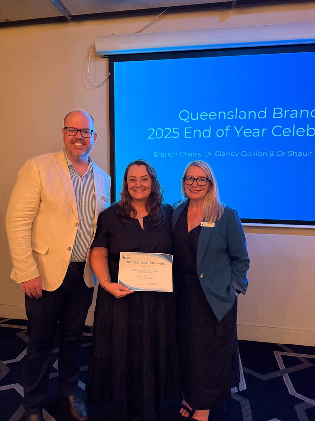 Supporting student education: Central West Health speech pathologist Samantha Nyman – centre – with Speech Pathology Australia Queensland Branch co-chair Dr Shaun Ziegenfusz
