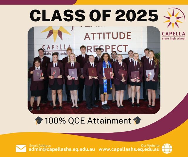 Capella State High School announced on social media that 100 per cent of the 2025 Year 12 cohort had successfully attained their Queensland Certificate of Education.