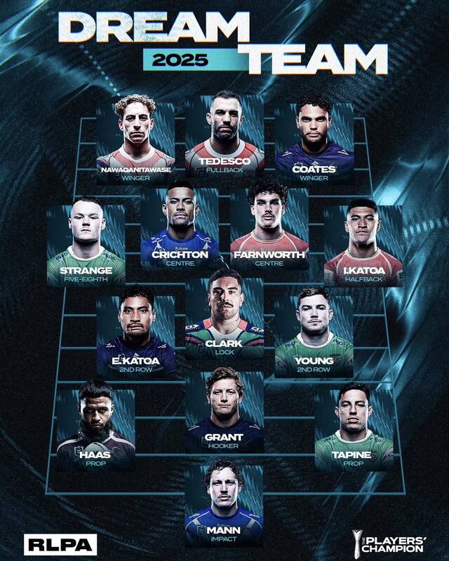 Kurt Mann has been voted by the players, in the RLPA Players' Dream Team, which features the best 14 players by their positions. (Rugby League Players Assoc.)