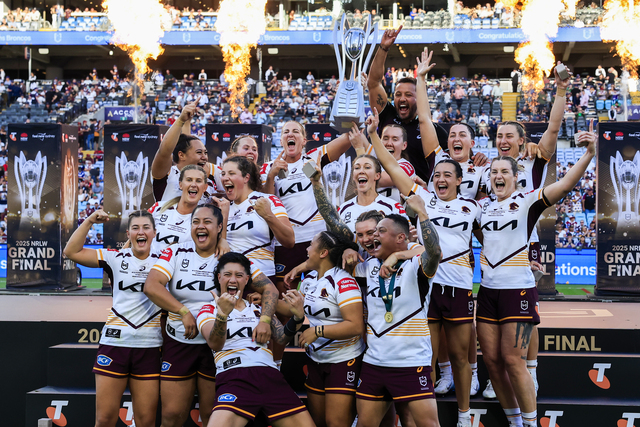 Central Queensland ace Tamika Upton and Ali Brigginshaw lift the NRLW premiership trophy after the Brisbane Broncos defeated the Sydney Roosters 22-18 in Sunday's grand final. (AAP Image/Mark Evans)